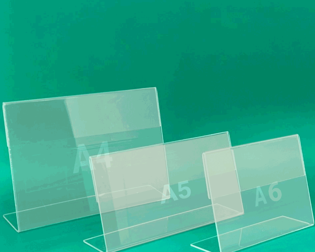 – استند پلکسی برای کاغذ A4: پرکاربردترین مدل برای دفاتر اداری، میزهای پذیرش و اطلاعرسانی.